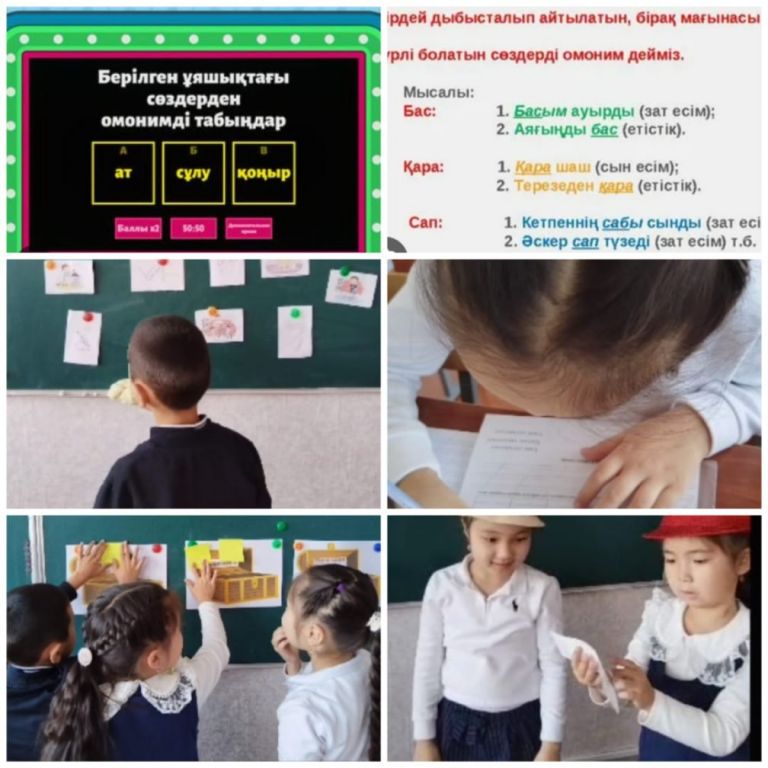 12.01.26ж. 2 "ә"сынып оқушыларымен функционалдық сауаттылық онкүндігі аясында «Омоним дегеніміз не? 14-18 жаттығулар» тақырыбында қазақ тілінен ашық сабақ өтті. Сабақта оқушылар 14–18-жаттығуларды орындау арқылы омоним сөздердің мағынасын ажыратуға үйренді. Сабақта сын тұрғысынан ойлауды дамытуға бағытталған әдіс-тәсілдер қолданылды.