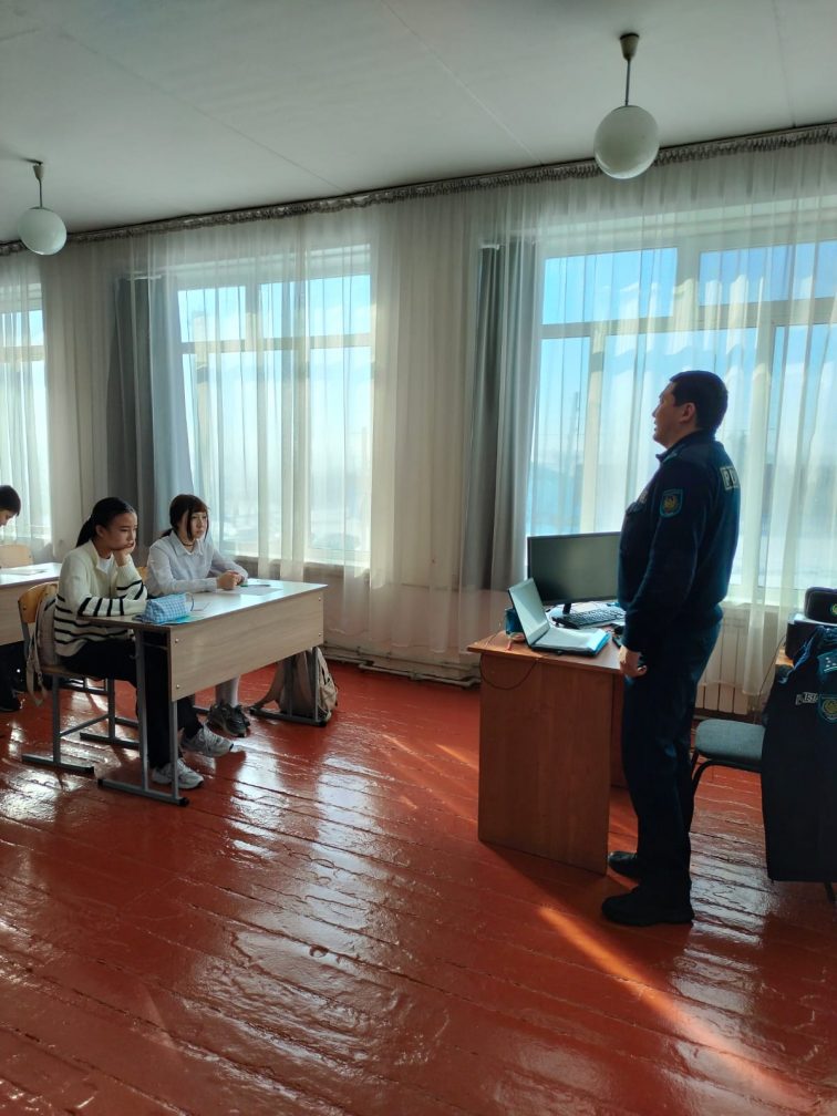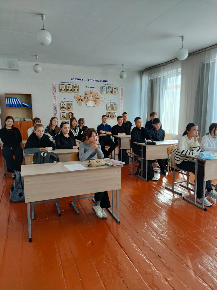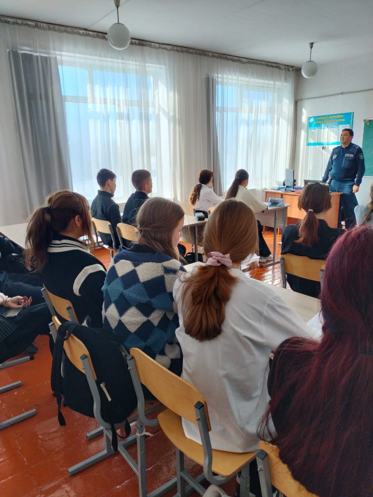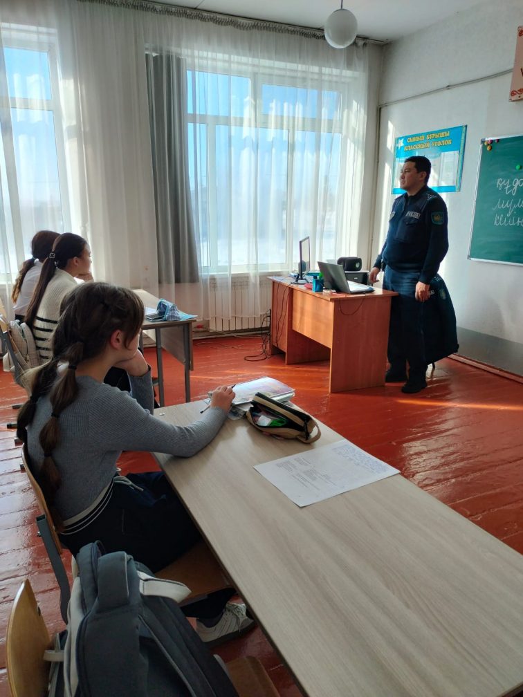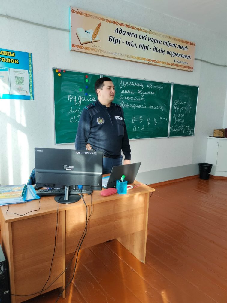 19.02.2026 жылы 8–9 сынып оқушыларымен учаскелік полиция инспекторы, полицияның аға лейтенанты Алтынбай А.Т. «Құқықбұзушылықтың алдын алу, кәмелетке толмағандар арасындағы қылмыс. Жолдағы қауіпсіздік» тақырыбында түсіндіру әңгімесін өткізді.