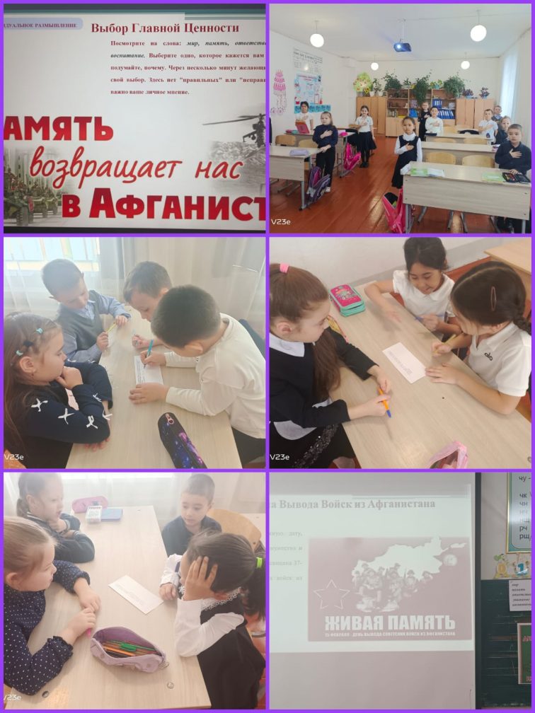 Кеңес әскерлерінің Ауғанстан жерінен шығарылғанына 37 жыл толуына орай 2а,3а сыныптар арасында сынып сағаты өтті. Бұл бейбітшіліктің қадірін тануға және тағдырлары ортақ тарихымызға енген тұлғаларды есте сақтауға мүмкіндік берді. Сынып жетекшісі: Н.А.Рюмина