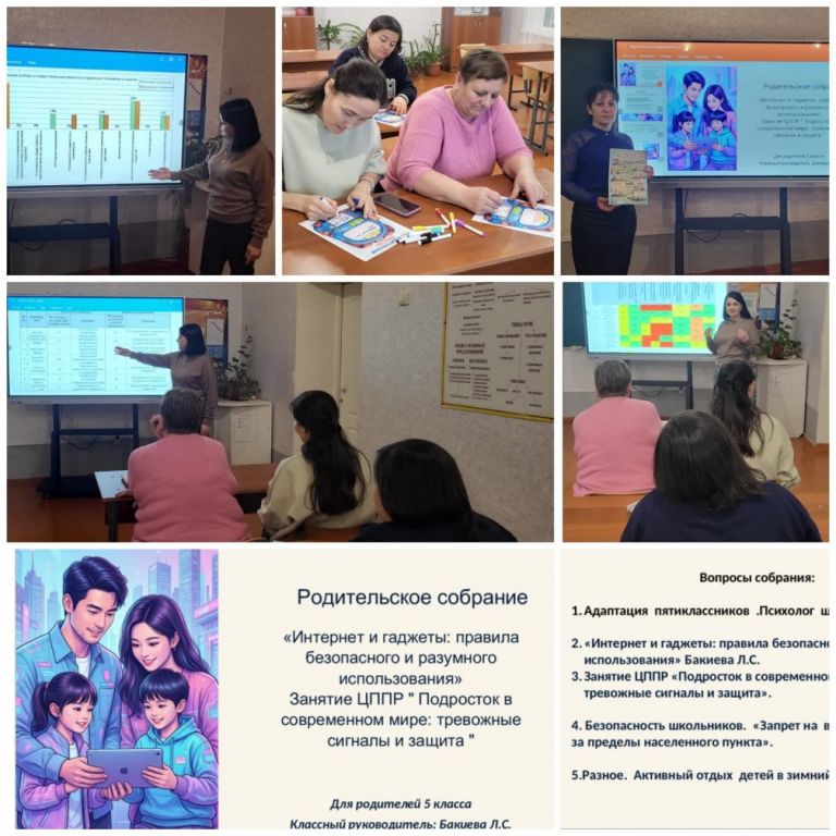 «Заң және тәртіп» жоспары аясында 5-сыныпта «Ғаламтор мен гаджеттер: қауіпсіз әрі саналы пайдалану ережелері» тақырыбында ата-аналар жиналысы өтті. Сондай-ақ ППҚО аясында «Жасөспірім қазіргі әлемде: алаңдататын белгілер және қорғау» тақырыбында сабақ ұйымдастырылды. Ата-аналар жиналысы барысында мектеп психологы Середа О.М. «Бесінші сынып оқушыларының бейімделуі» тақырыбында баяндама жасады. Ата-аналар балалардың орта буынға бейімделу үдерісінің қалай өткенін біліп, ұжымды нығайтуға арналған тренингке белсенді түрде қатысты. Сынып жетекшісі: Бакиева Л.С.