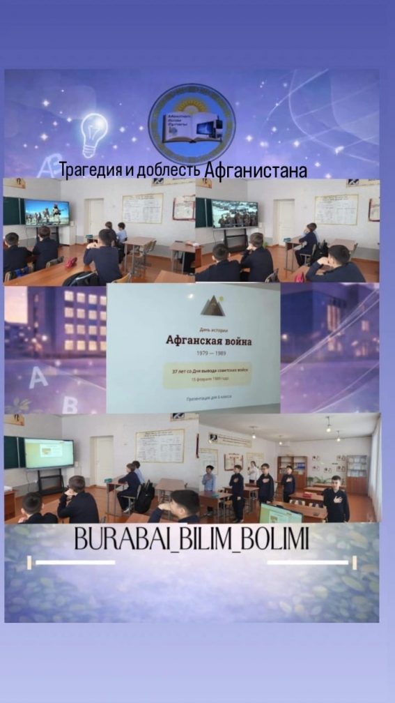 Бүгін 6-сыныпта ерекше тәрбие сағаты өтті. Біз тарих парақтарында алтын әріппен жазылған айтулы күн — 1989 жылдың 15 ақпаны туралы сыр шерттік. Кеңес әскерлерінің Ауған жерінен шығарылғанына биыл тура 37 жыл толды. Бүгінгі ұрпақ үшін бұл — оқулықтағы деректер болғанымен, әрбір санның артында тағдырлар тоғысы, жерлестеріміздің ерен ерлігі мен бейбітшіліктің баға жетпес сабағы жатыр. Біз тек өткенді еске алып қана қоймай, болашақты баянды етуді үйрендік. Оқушыларымыз жасанды интеллект мүмкіндіктерін пайдалана отырып, тарихи жады мен заманауи технологияны ұштастыры, өздерінің «Бейбіт аспан» бейнелерін жасап шықты. Өткенді ұмытпау — бүгінгі бақытты күнімізді қадірлей білу деген сөз.