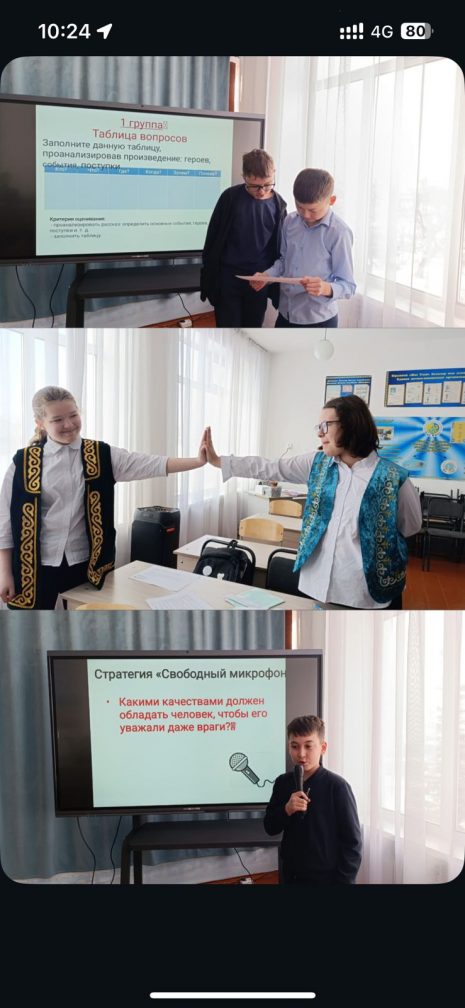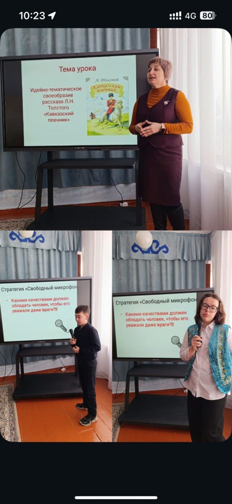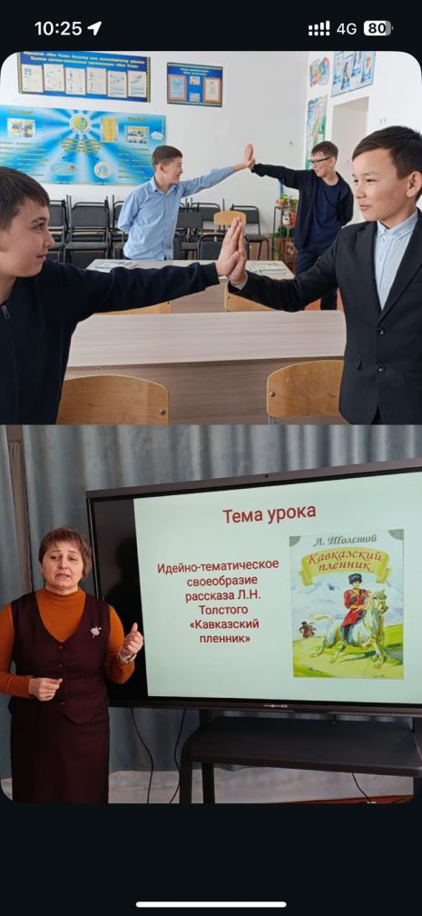 6-сыныпта «Л.Н. Толстойдың «Кавказ тұтқыны» әңгімесінің идеялық-тақырыптық ерекшелігі» тақырыбында ашық әдебиет сабағы өтті. Сабақта оқушылардың сыни ойлауын дамытуға ерекше көңіл бөлінді. Кейіпкерлердің мінез-құлық стратегияларына салыстырмалы талдау жүргізіліп, олардың тиімділігі мен адамгершілік қырлары бағаланды. Пікірталас әдісін қолдану оқушыларға шығарманың негізгі идеясын түсінуге ғана емес, сонымен қатар өз көзқарастарын дәлелді түрде қорғауға, классикалық мәтін мен өмірлік жағдайлардың арасындағы байланысты табуға мүмкіндік берді. Сабақтың басты қорытындысы — адамның шынайы күші жағдайға байланысты емес, оның батылдығында, мейірімділігінде және белсенді өмірлік ұстанымында. Орыс тілі мен әдебиеті пәнінің мұғалімі: Қасымова Ю.В.