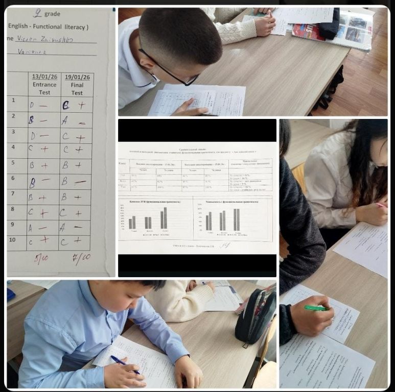 ункционалдық сауаттылық онкүндігі аясында 7, 8 және 9 сынып оқушылары арасында ағылшын тілі бойынша диагностика жүргізілді. Диагностиканың мақсаты - оқушылардың функционалдық сауаттылық деңгейін анықтау. Кіріс және шығыс диагностикасының салыстырмалы талдау нәтижелері бойынша оқушыларда оң динамика байқалады. 7 сыныпта білім сапасы 8%-ға, үлгерімі 16%-ға артты. 8 сыныпта нәтиже тұрақты, ерекше өзгерістер жоқ. 9 сыныпта білім сапасының артуы 16% құрады. Жүргізілген диагностика функционалдық сауаттылық дағдыларын дамытуға бағытталған тапсырмалардың тиімділігін көрсетті, бұл оқушылардың тілдік біліктерін жақсартуға ықпал етеді. Жауапты - ағылшын тілі мұғалімі Ломачинская Л.В.