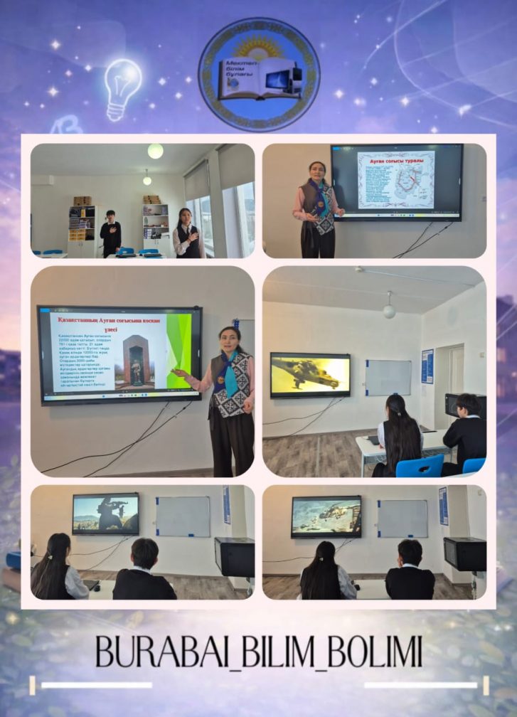 «Тарихқа тағзым» тақырыбында 8 сынып оқушыларына Ауған соғысына арналған сынып сағаты өткізілді. Іс-шара барысында оқушылар Ауған соғысының тарихи маңызы, жауынгерлердің ерлігі мен батырлығы туралы мәлімет алып, Отан алдындағы борыш, бейбіт өмірдің құндылығы жөнінде ой қозғады. Батырлардың есімі – ұрпақ жадында мәңгі сақталады. Сынып жетекшісі: Ибраева С.А.